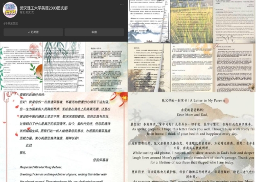 为深入学习贯彻党的二十大精神,传承红色基因,弘扬爱国精神,学院英语2303团支部结合专业特色,开展了一系列以“红色家书”为主题的教育活动。通过诵读、翻译、参观、创作等多种形式,将红色文化与语言学习深度融合,引导青年学子在感悟革命精神中坚定理想信念,在传承红色血脉中强化使命担当。
